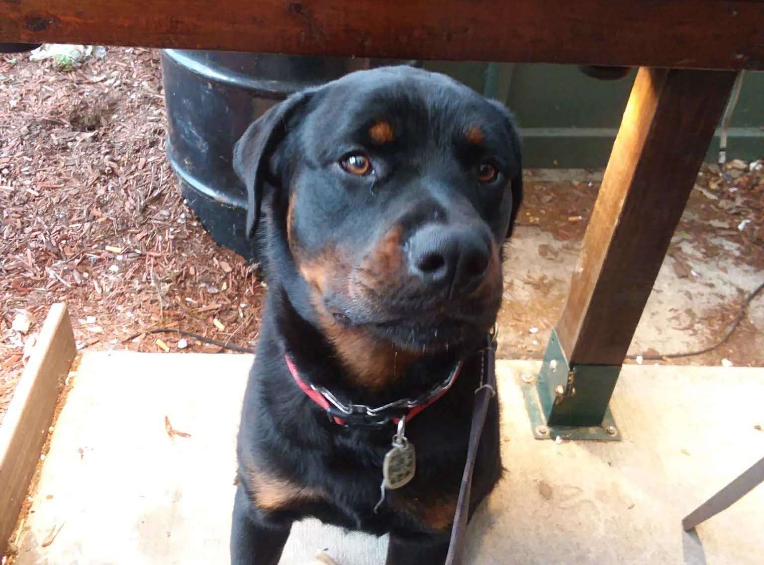 I took Hercules to a pretty busy restaurant that usually has lots of dogs that go there and lots of dogs walk by it. It was evening and cooler than midday for him. I took a tall table and settled him into the corner behind the table. I didn’t realize and he didn’t see that a medium-sized doodle was at the next table over! It was young and yappy so Hercules saw him soon enough.